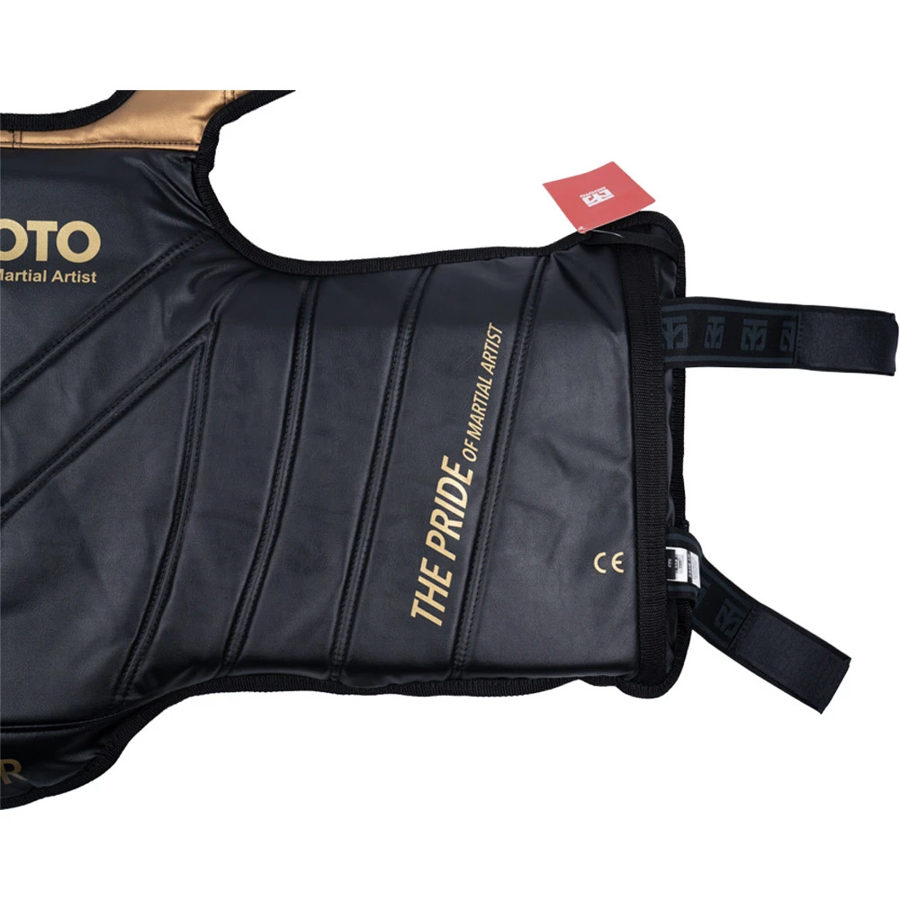 This is a Mooto chest guard which has been authenticated by WTF, and its durability has been upgraded much more by a dual treatment of all the sealing, along with its shock-absorbing ability.