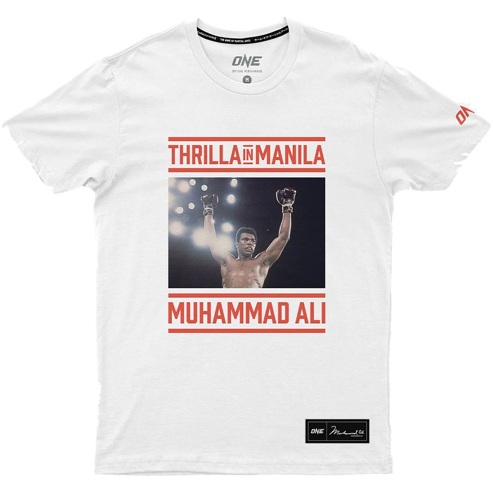The Thrilla in Manila Tee pays homage to one of Muhammad Ali’s most famous fights. Featuring a coloured photograph of Muhammad Ali from the event and sleek typography in red, there is no better way to commemorate this moment in history. Part of our limited edition ONE x Muhammad Ali collection
